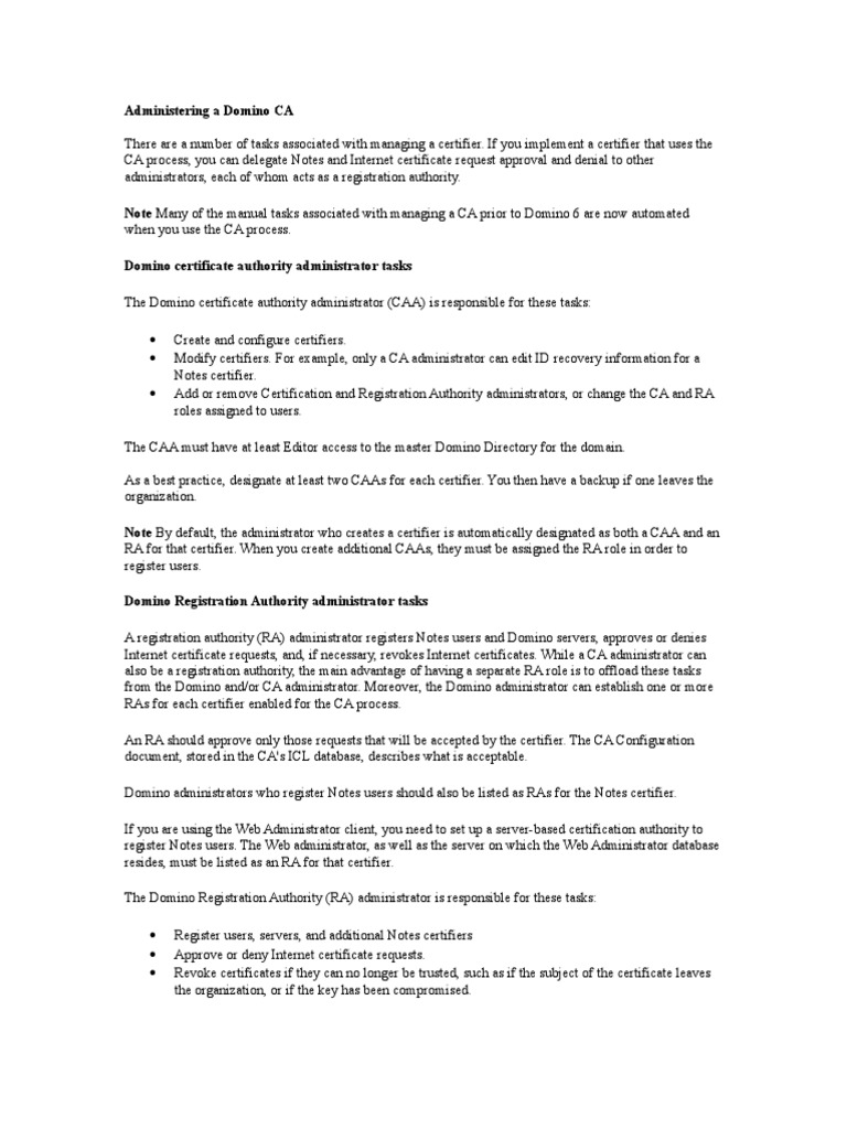The !omino certificate authority administrator #CAA$ is responsible for these tasks%