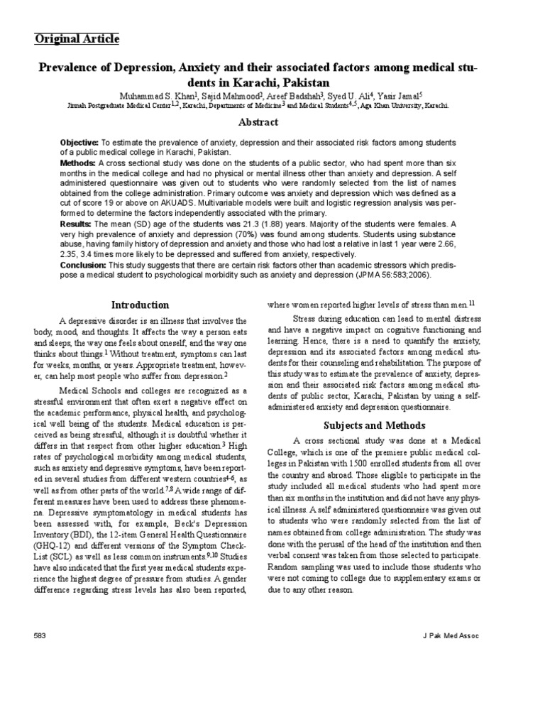 pose a medical student to psychological morbidity such as anxiety and depression (JPMA 56:583;2006).