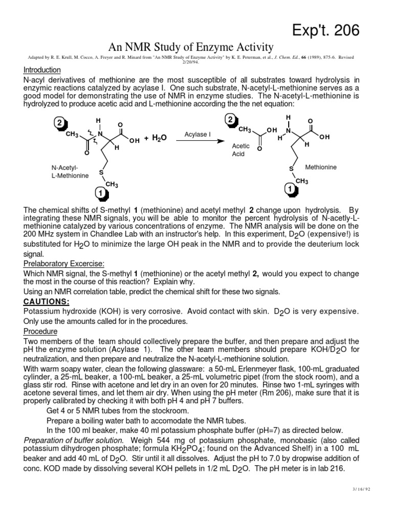 Adapted by R. E. Krull, M. Cocco, A. Freyer and R. Minard from "An NMR Study of Enzyme Activity" by K. E. Peterman, et al., J. Chem. Ed., 66 (1989), 875-6. Revised