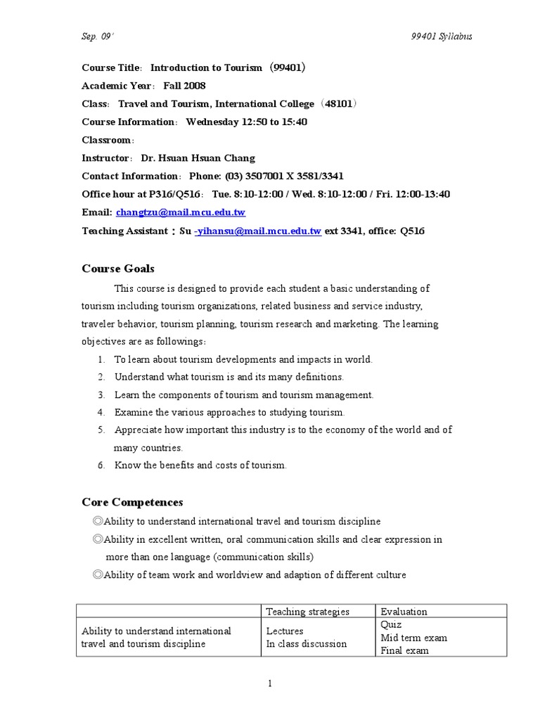 Course TitleIntroduction to Tourism99401