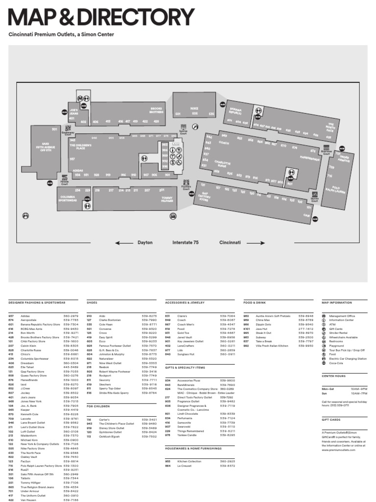PREMIUMOUTLETS.COM STORE LISTINGS SUBJECT TO CHANGE USE AREA CODE (513) FOR ALL PHONE NUMBERS UNLESS NOTED