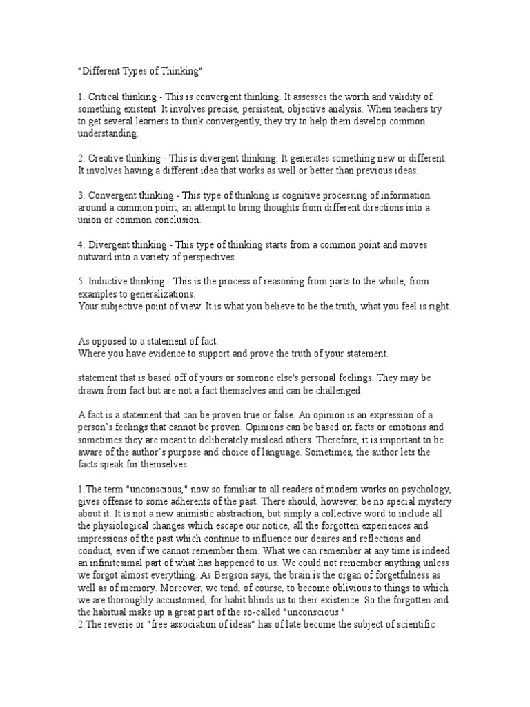 1. Critical thinking - This is convergent thinking. It assesses the worth and validity of