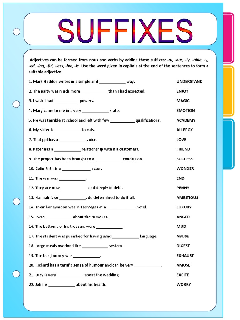 Adjectives can be formed from nous and verbs by adding these suffixes: -al, -ous, -ly, -able, -y,