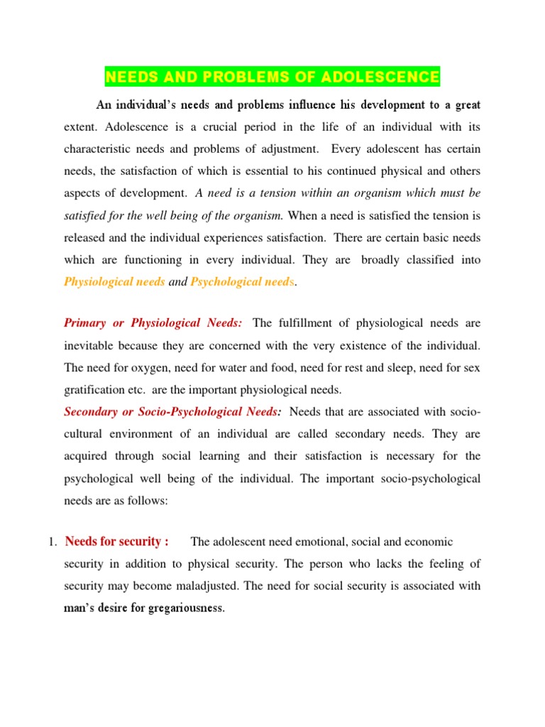 NEEDS AND PROBLEMS OF ADOLESCENCE
