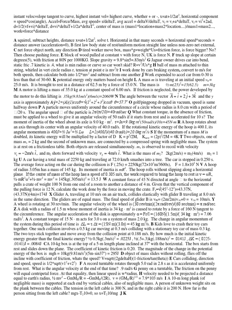 = speed*cos(angle), Accel=Force/Mass, avg speed= s/deltaT, avg accel = deltaV/deltaT, v