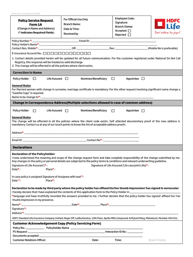 Customer Acknowledgement Copy (Policy Servicing Form)