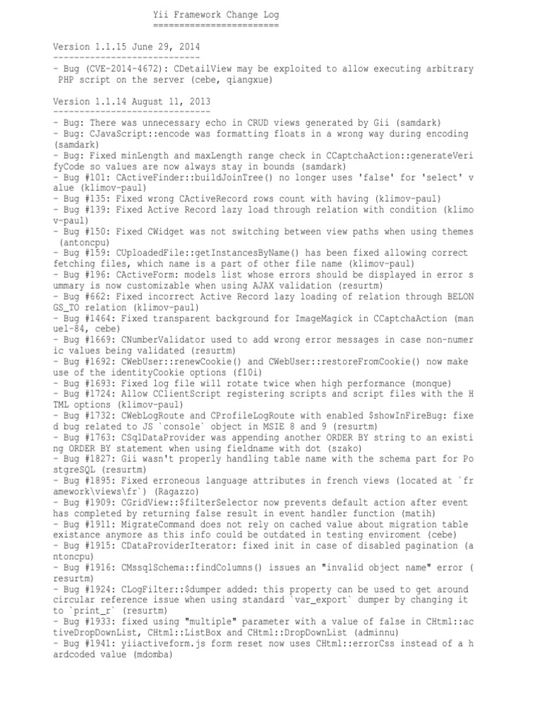 Change Log For Yii