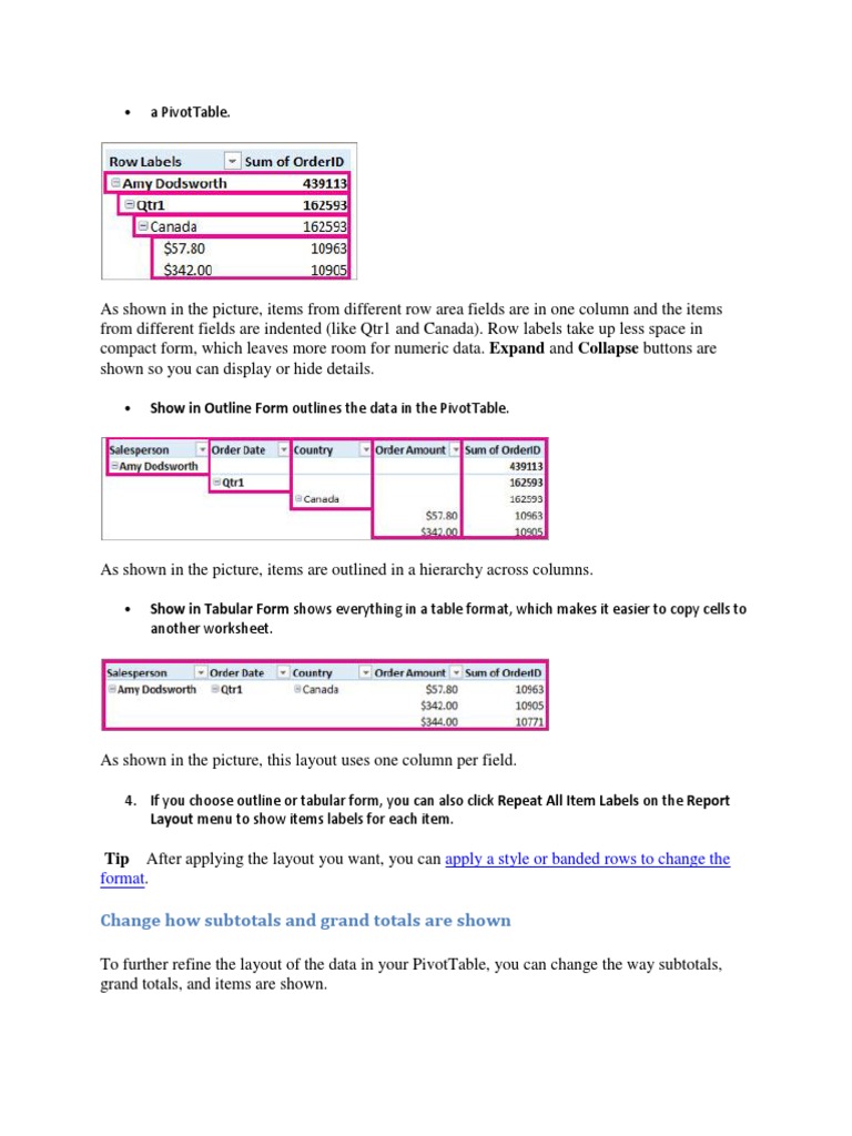 To further refine the layout of the data in your PivotTable, you can change the way subtotals,