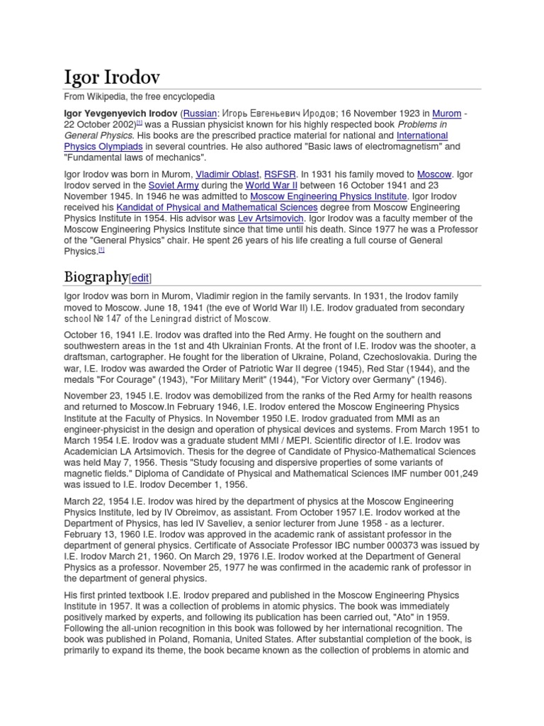 November 1945. In 1946 he was admitted to Moscow Engineering Physics Institute. Igor Irodov