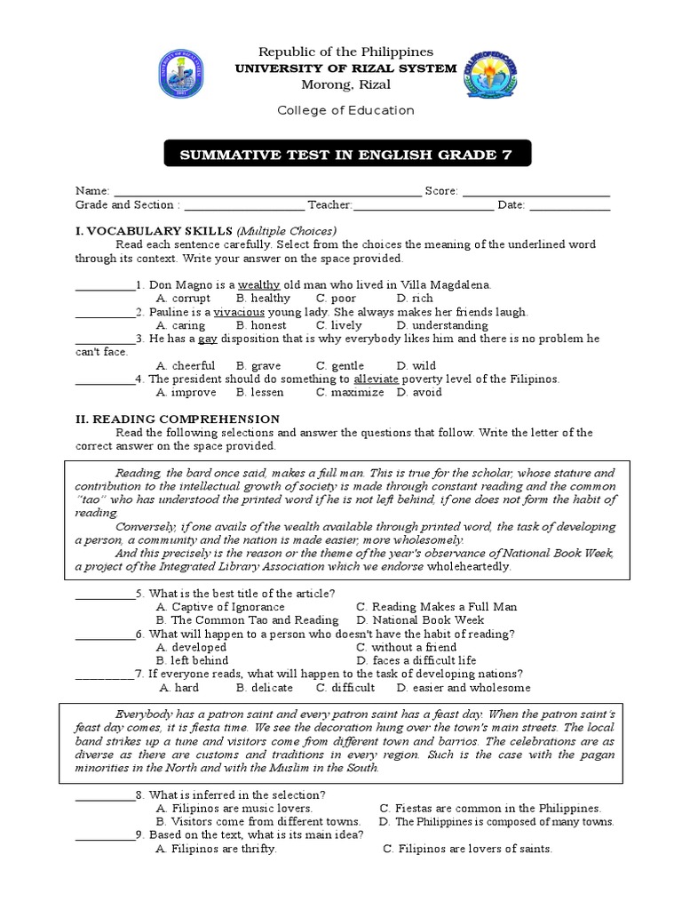 SUMMATIVE TEST IN ENGLISH GRADE 7
