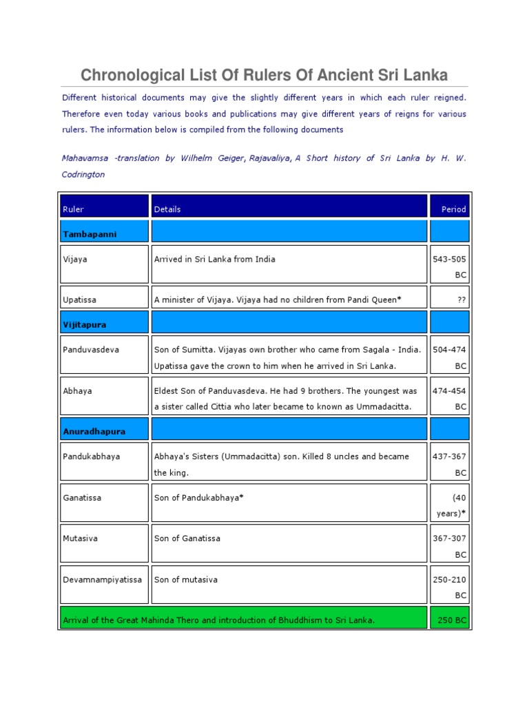 Chronological List Of Rulers Of Ancient Sri Lanka