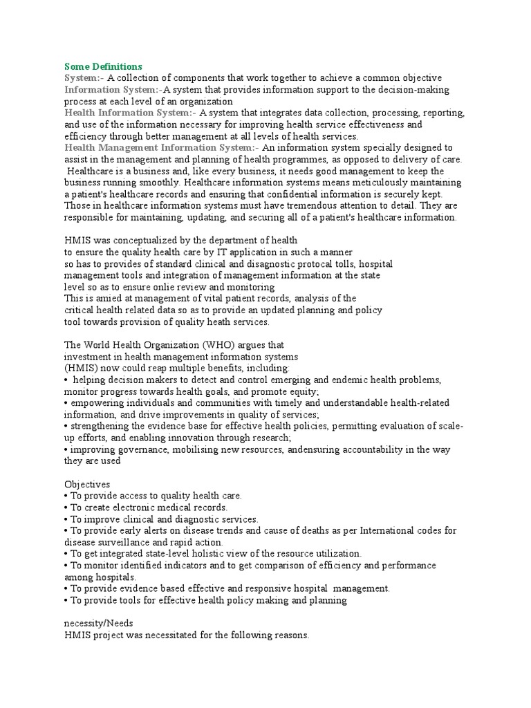 Health Information System:- A system that integrates data collection, processing, reporting,