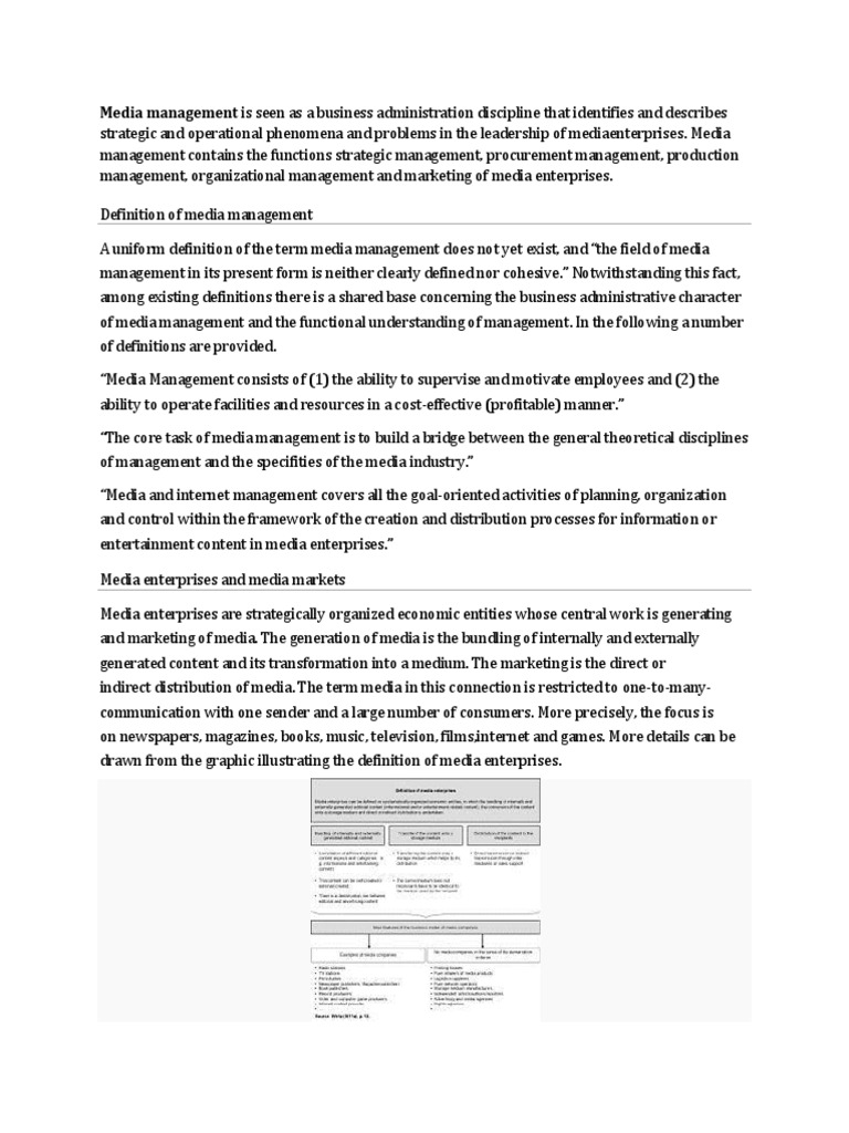 A uniform definition of the term media management does not yet exist, and the field of media