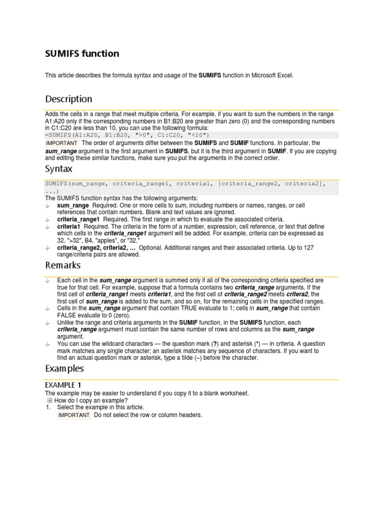 IMPORTANT The order of arguments differ between the SUMIFS and SUMIF functions. In particular, the