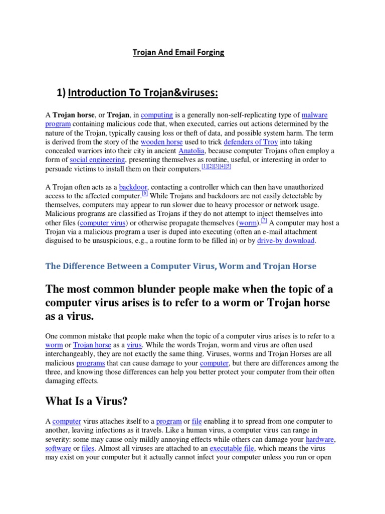 A Trojan horse, or Trojan, in computing is a generally non-self-replicating type of malware