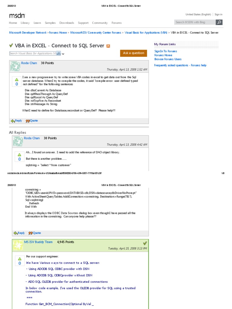 Microsoft Developer Network >Forums Home > Microsoft ISV Community Center Forums > Visual Basic for Applications (VBA) > VBA in EXCEL - Connect to SQL Server