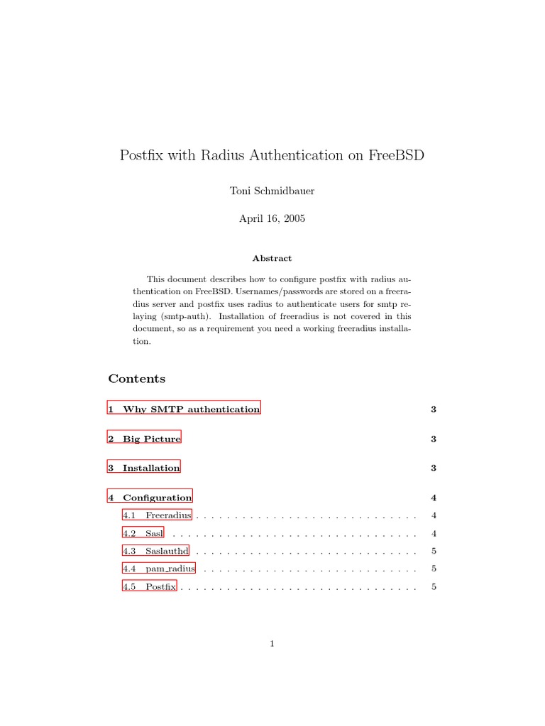 This document describes how to configure postfix with radius authentication on FreeBSD. Usernames/passwords are stored on a freeradius server and postfix uses radius to authenticate users for smtp relaying (smtp-auth). Installation of freeradius is not covered in this