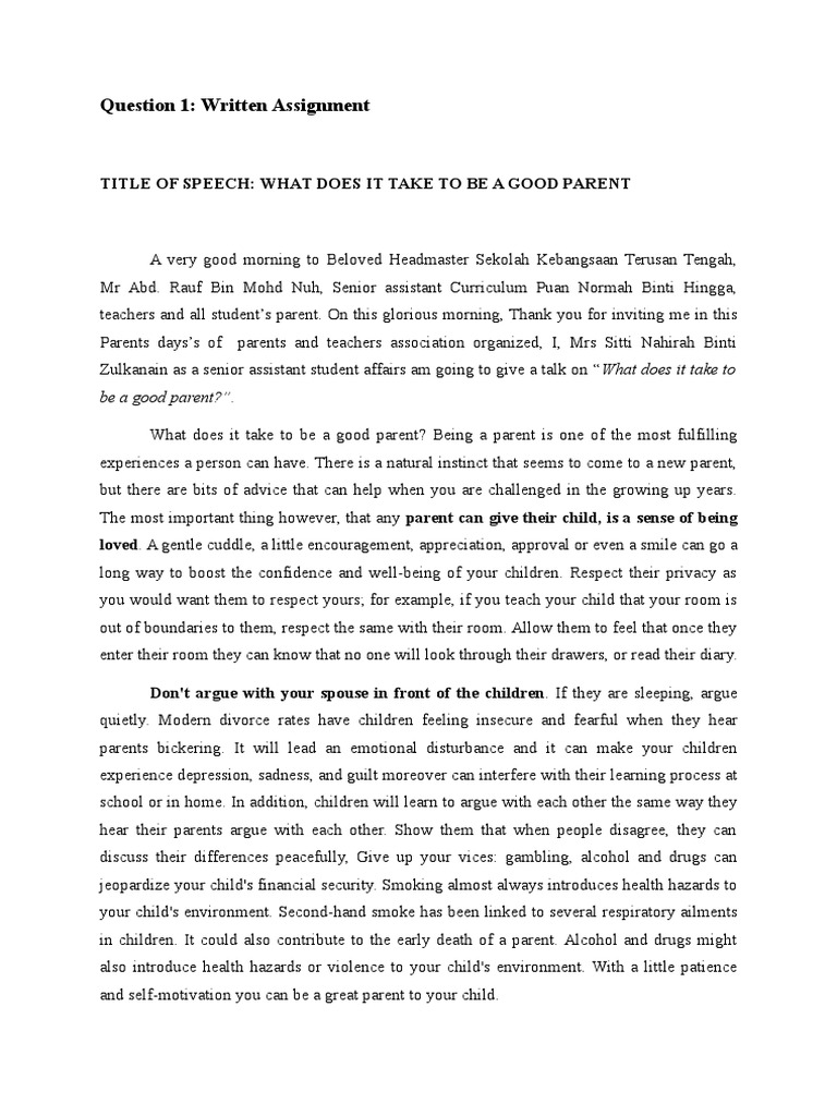 TITLE OF SPEECH: WHAT DOES IT TAKE TO BE A GOOD PARENT