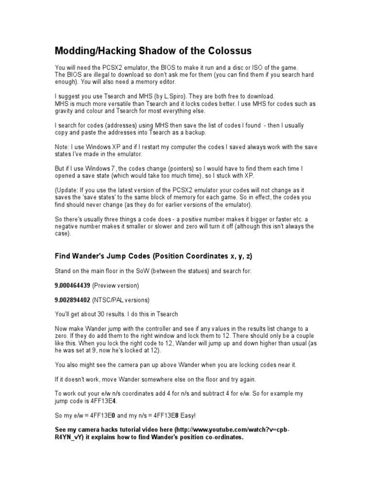 To shift the camera to a colossus or other object you need to know Wander's position coordinates - his up/down, east/west, north/south values - see above.
