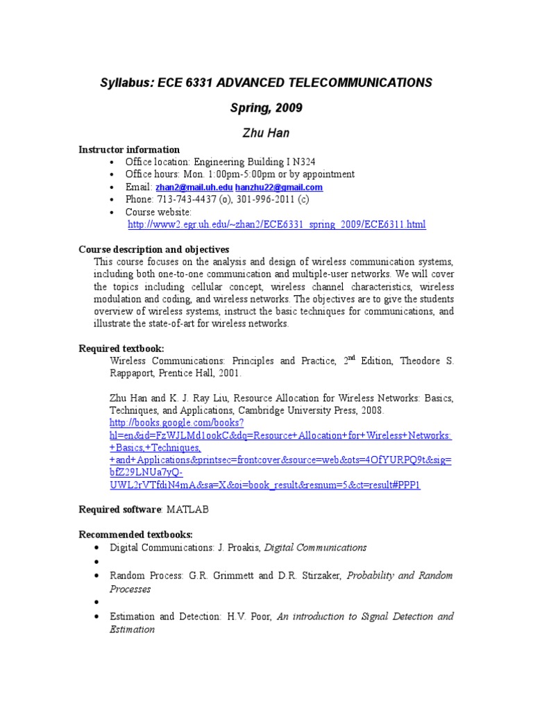 Syllabus: ECE 6331 ADVANCED TELECOMMUNICATIONS