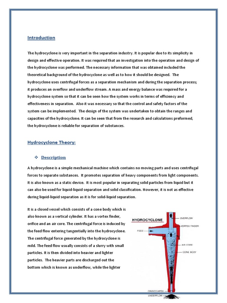 theoretical background of the hydrocyclone as well as to how it should be designed. The