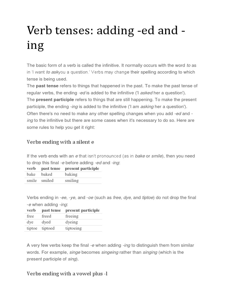 Often there's no need to make any other spelling changes when you add -ed and ing to the infinitive but there are some cases when it's necessary to do so. Here are