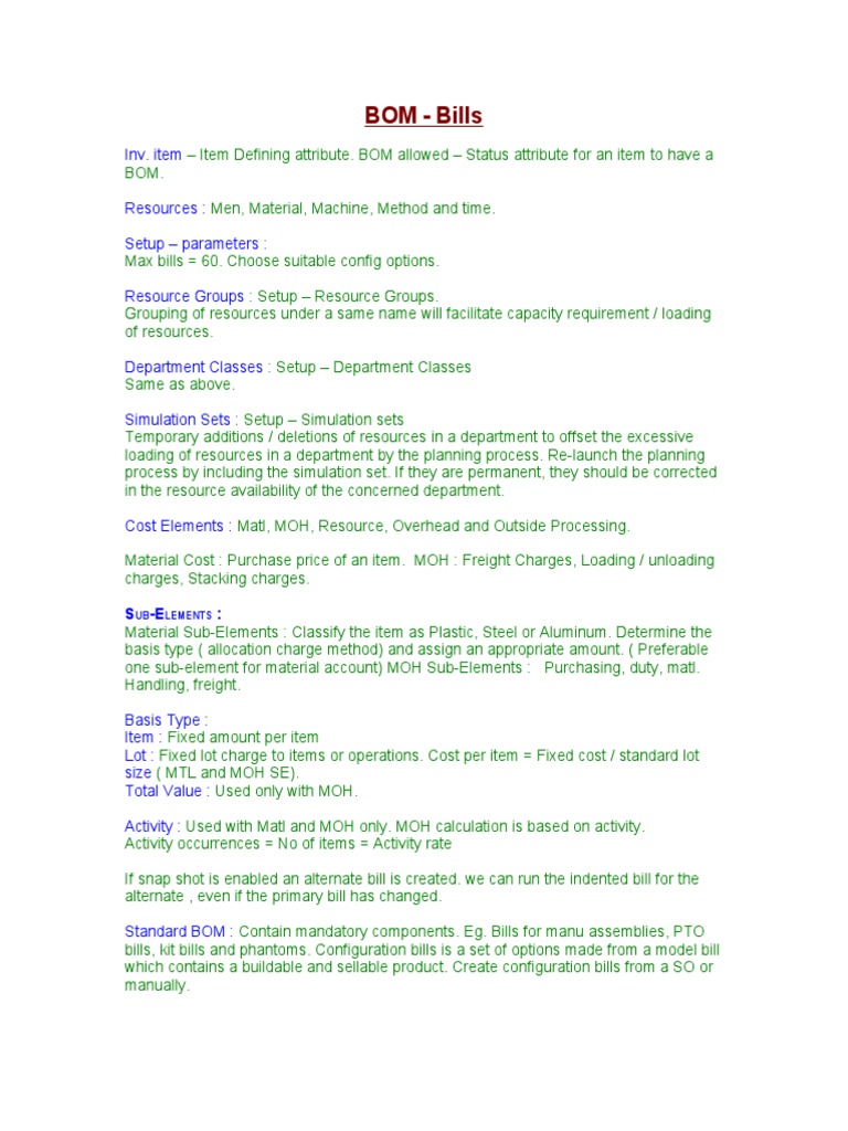 Standard BOM : Contain mandatory components. Eg. Bills for manu assemblies, PTO