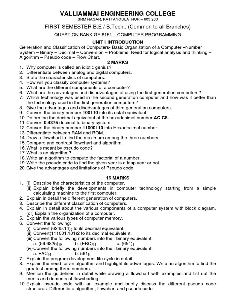 QUESTION BANK GE 6151 COMPUTER PROGRAMMING