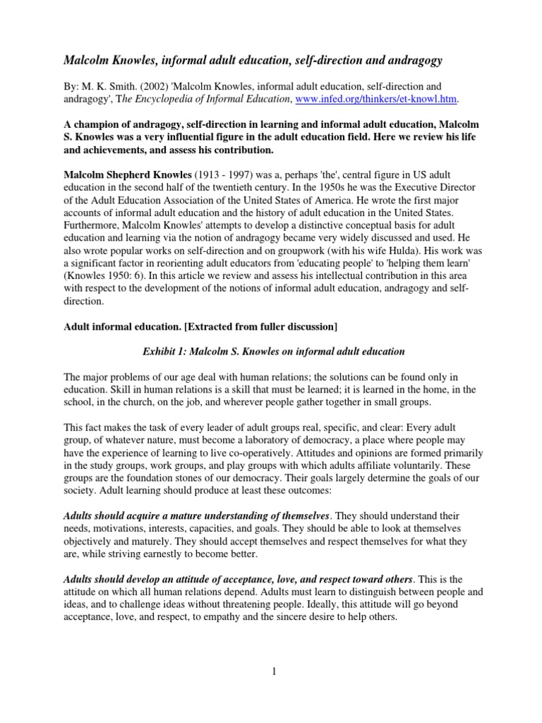 To cite this article: Smith, M. K. (2002) 'Malcolm Knowles, informal adult education, selfdirection and anadragogy', the encyclopedia of informal education, www.infed.org/thinkers/etknowl.htm. Last updated: Mark K. Smith 2002