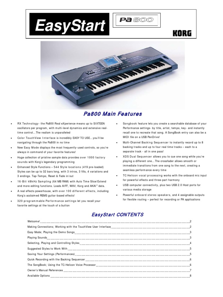 The Pa800 is the most powerful arranger available. This guide will familiarize you with its basic operation, and