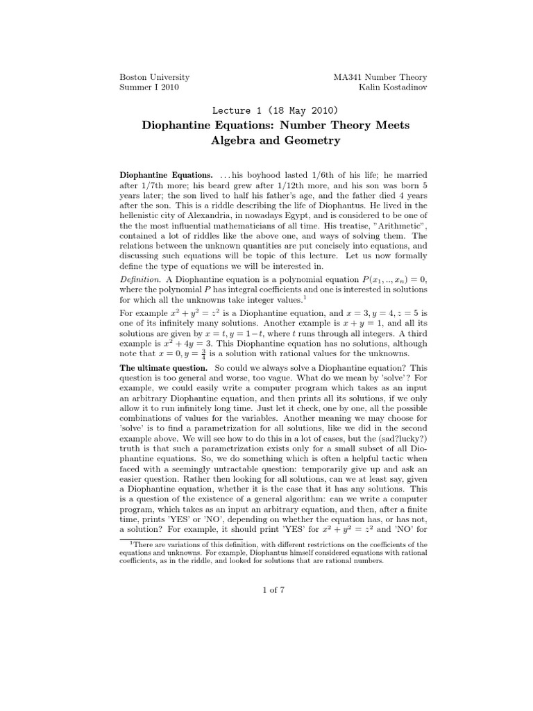 Definition. A Diophantine equation is a polynomial equation P (x1 , .., xn ) = 0,