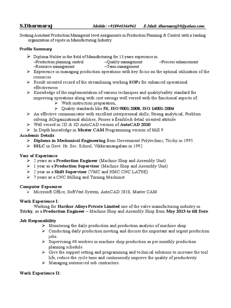 manufacturing industry in Bangalore, as a Production Supervisor Machine Shop and Assembly