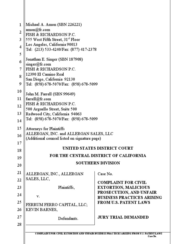 COMPLAINT FOR CIVIL EXTORTION AND UNFAIR BUSINESS PRACTICES ARISING FROM U.S. PATENT LAWS