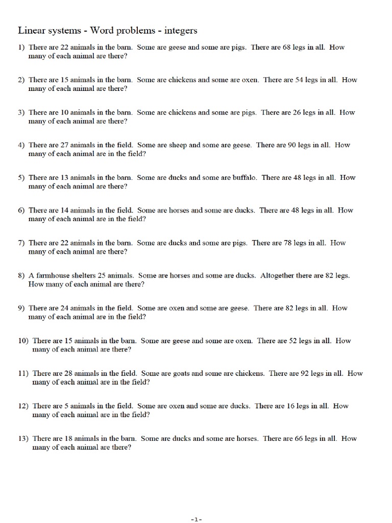 33) There are 10 animals in the barn. Some are geese and some are goats. There are 30 legs in all. How