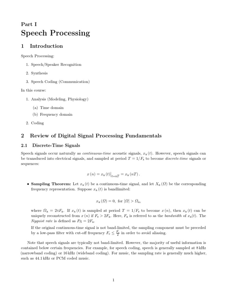 Speech signals occur naturally as continuous-time acoustic signals, xa (t). However, speech signals can