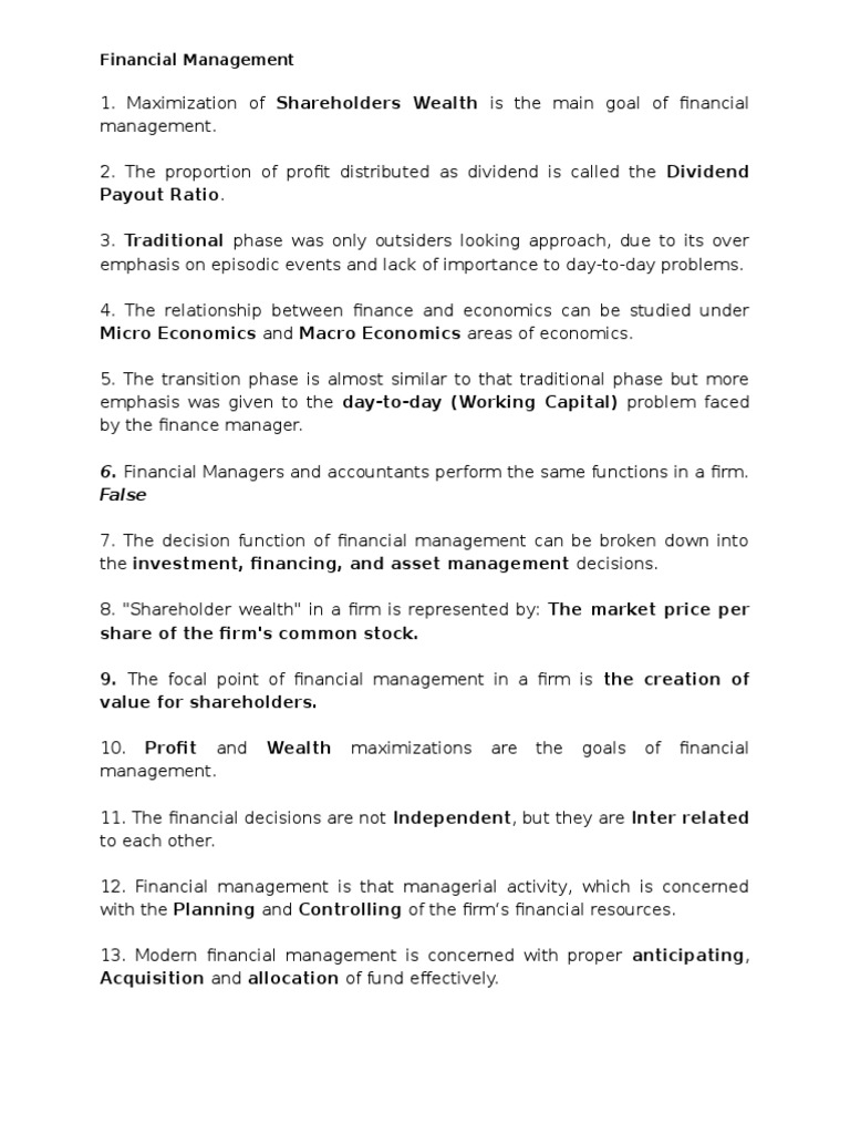 1. Maximization of Shareholders Wealth is the main goal of financial
