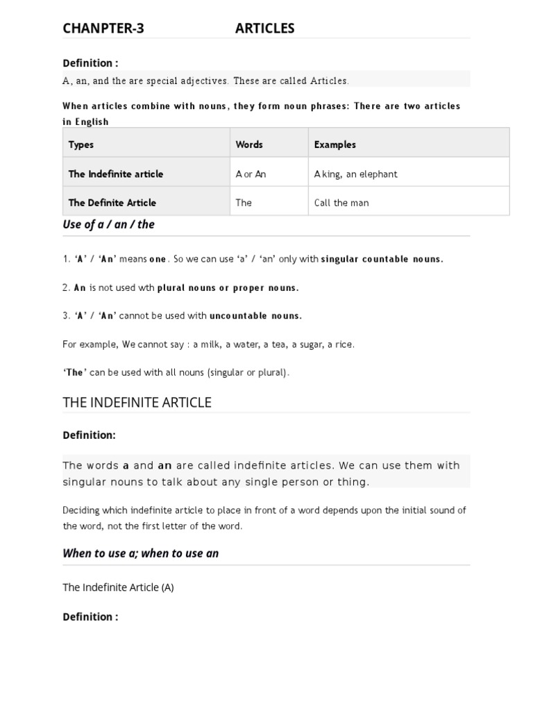 indefinite (a, an). When an article is used, another adjective can also be used between