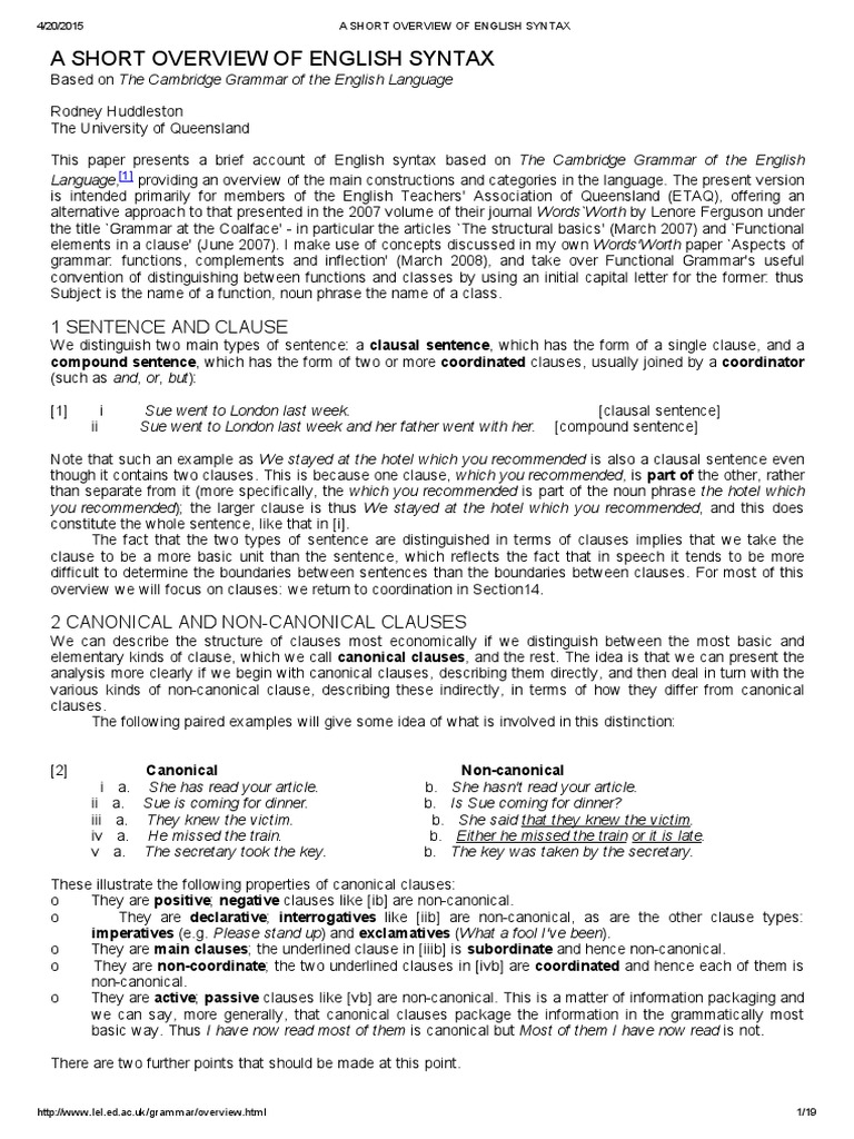 This paper presents a brief account of English syntax based on The Cambridge Grammar of the English