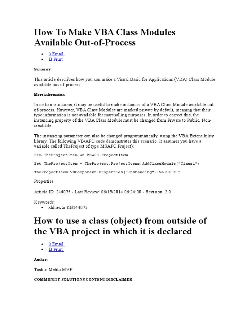 In certain situations, it may be useful to make instances of a VBA Class Module available outof-process. However, VBA Class Modules are marked private by default, meaning that their