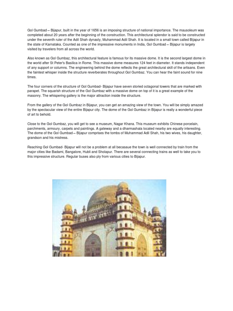 the state of Karnataka. Counted as one of the impressive monuments in India, Gol Gumbad Bijapur is largely