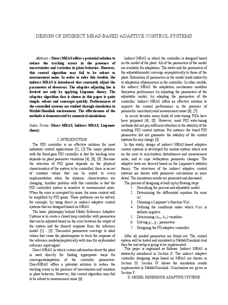 Index Terms- Direct MRAS, Indirect MRAS, Liapunov
