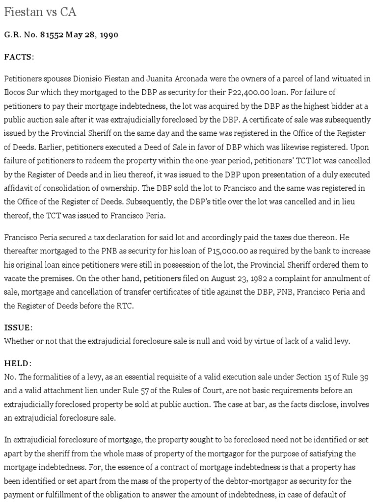 Whether or not that the extrajudicial foreclosure sale is null and void by virtue of lack of a valid levy.