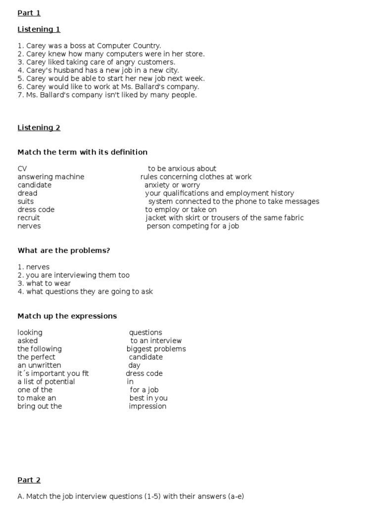 A. Match the job interview questions (1-5) with their answers (a-e)