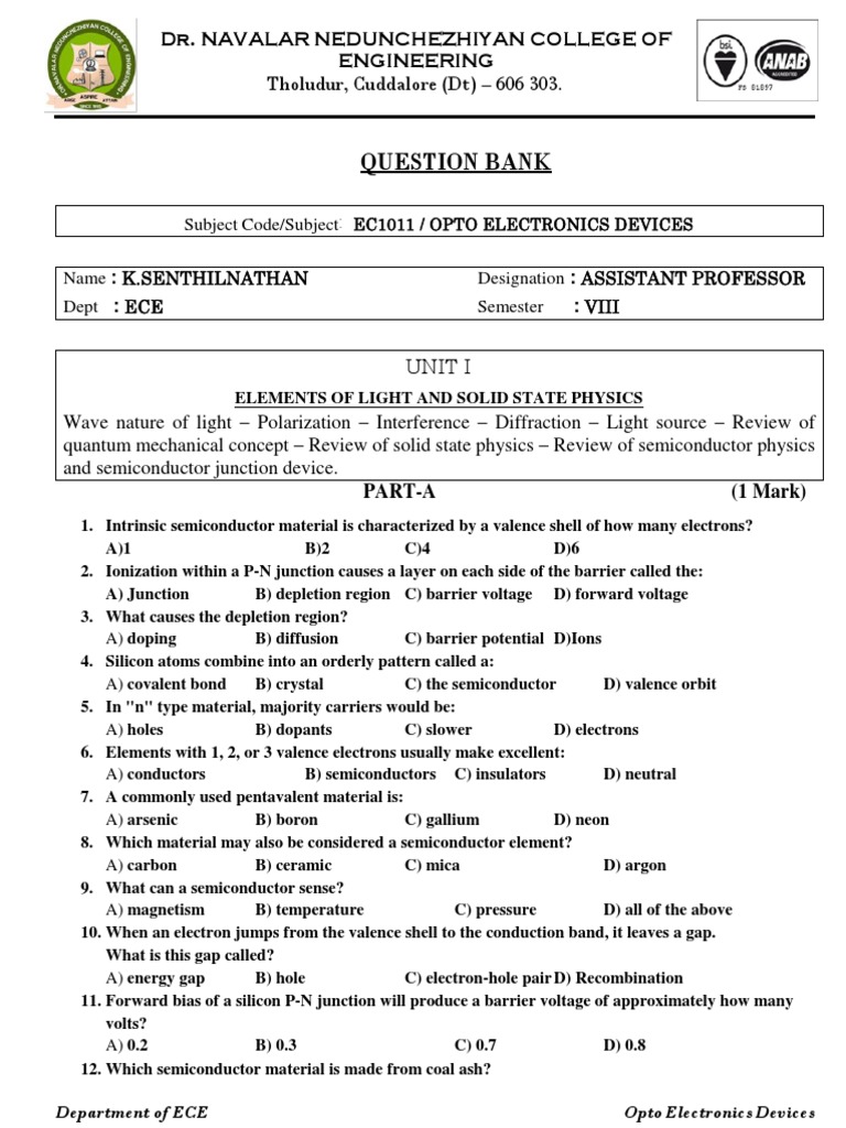 Subject Code/Subject: EC1011 / OPTO ELECTRONICS DEVICES