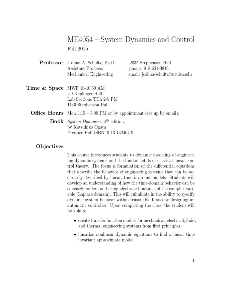 This course introduces students to dynamic modeling of engineering dynamic systems and the fundamentals of classical linear control theory. The focus is formulation of the dierential equations