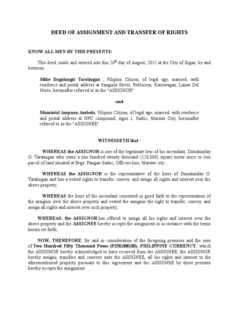 WHEREAS the ASSIGNOR is the representative of the heirs of Dimatunday O.