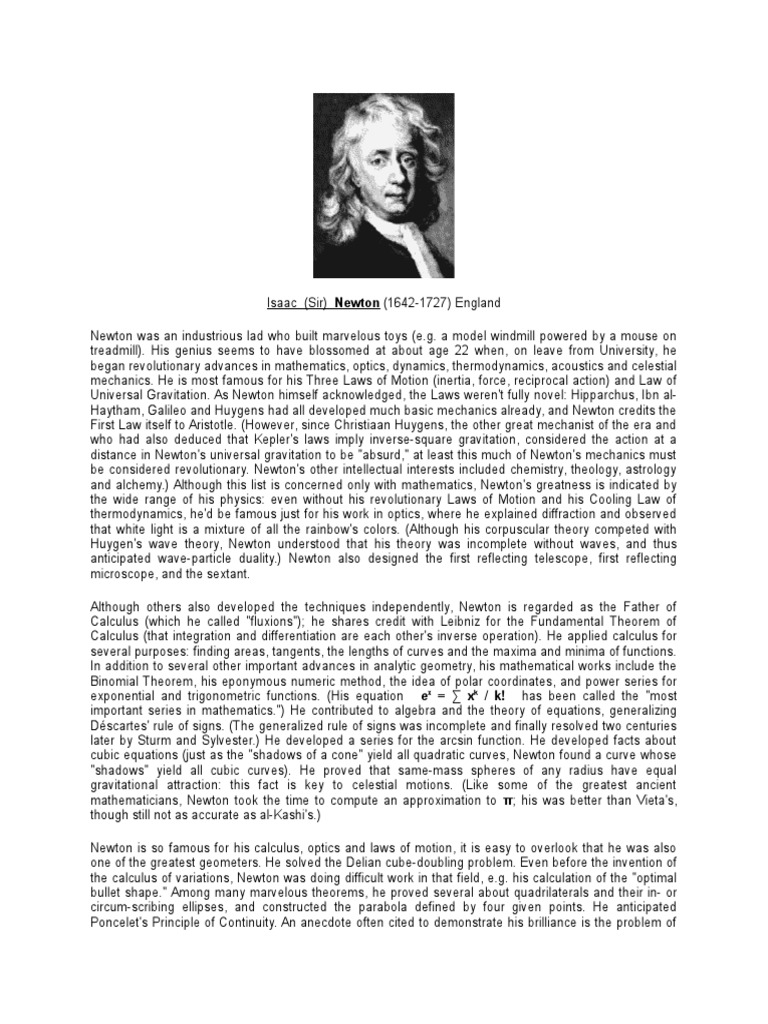 and alchemy.) Although this list is concerned only with mathematics, Newton's greatness is indicated by
