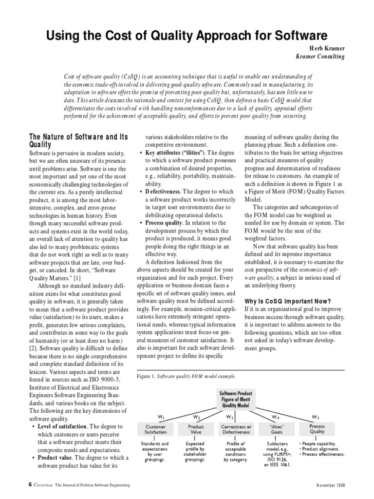Cost of software quality (CoSQ) is an accounting technique that is useful to enable our understanding of