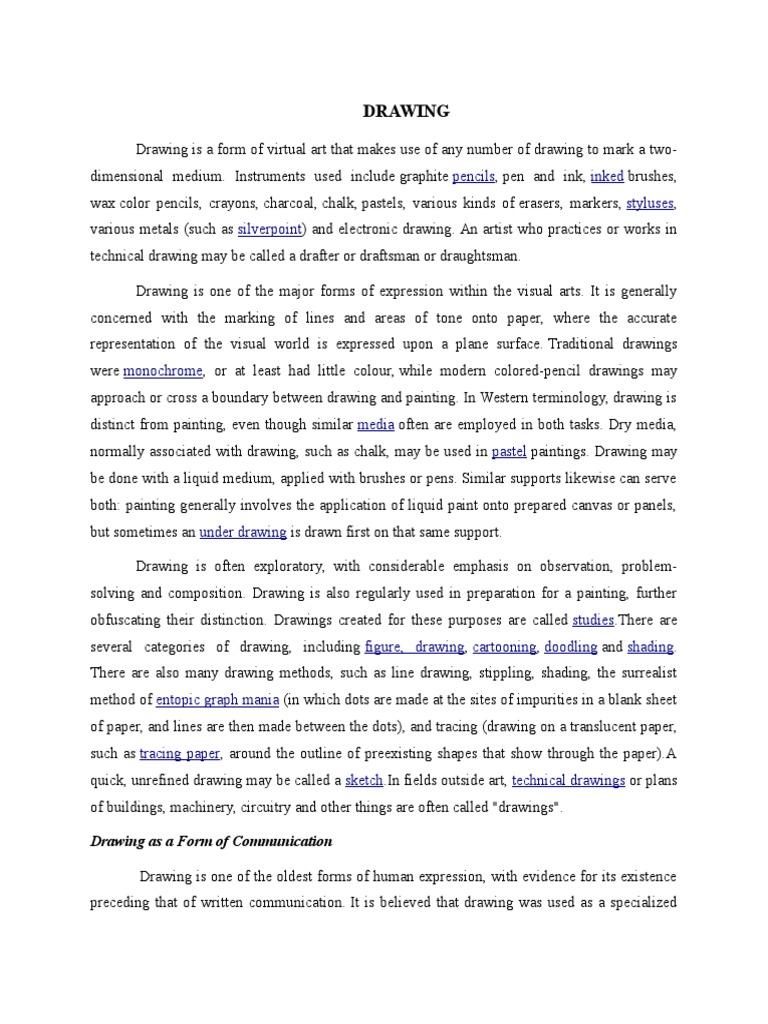 Drawing is a form of virtual art that makes use of any number of drawing to mark a twodimensional medium. Instruments used include graphite pencils, pen and ink, inked brushes,