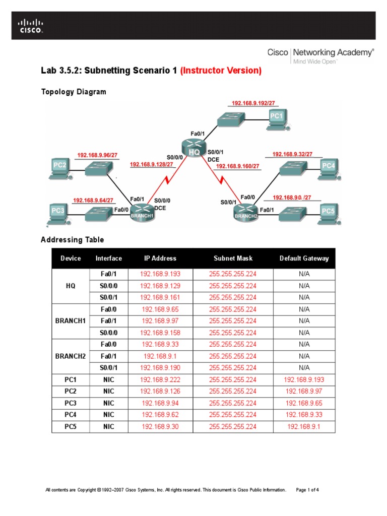 addressing for the network shown in the Topology Diagram. The network has the following addressing